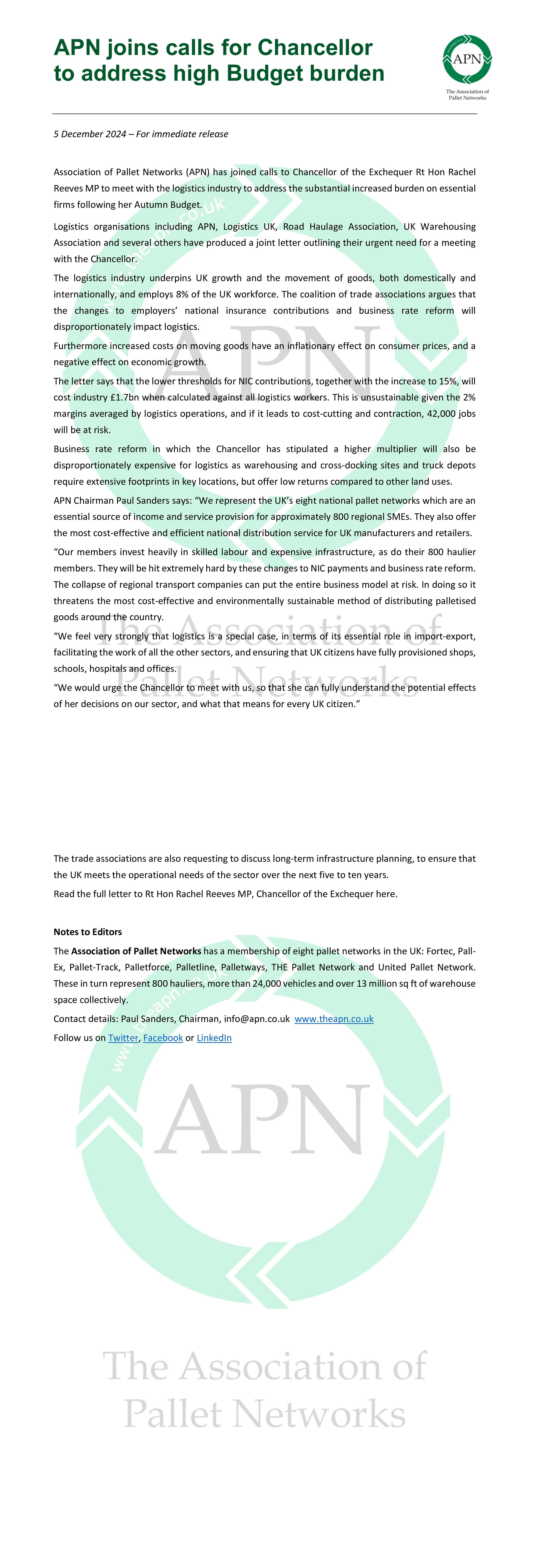 Association of Pallet Networks (APN) has joined calls to Chancellor of the Exchequer Rt Hon Rachel